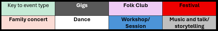 Please note- The entries are checked regularly but sometimes events are cancelled or venues change. Please double check venue and date before booking. Sheffield Folk Guide is not responsible for any losses due to changes or errors in the listing. For all sessions please see Jaki’s Sheffield Music Sessions website. The colours of the blocks indicates the type of event: