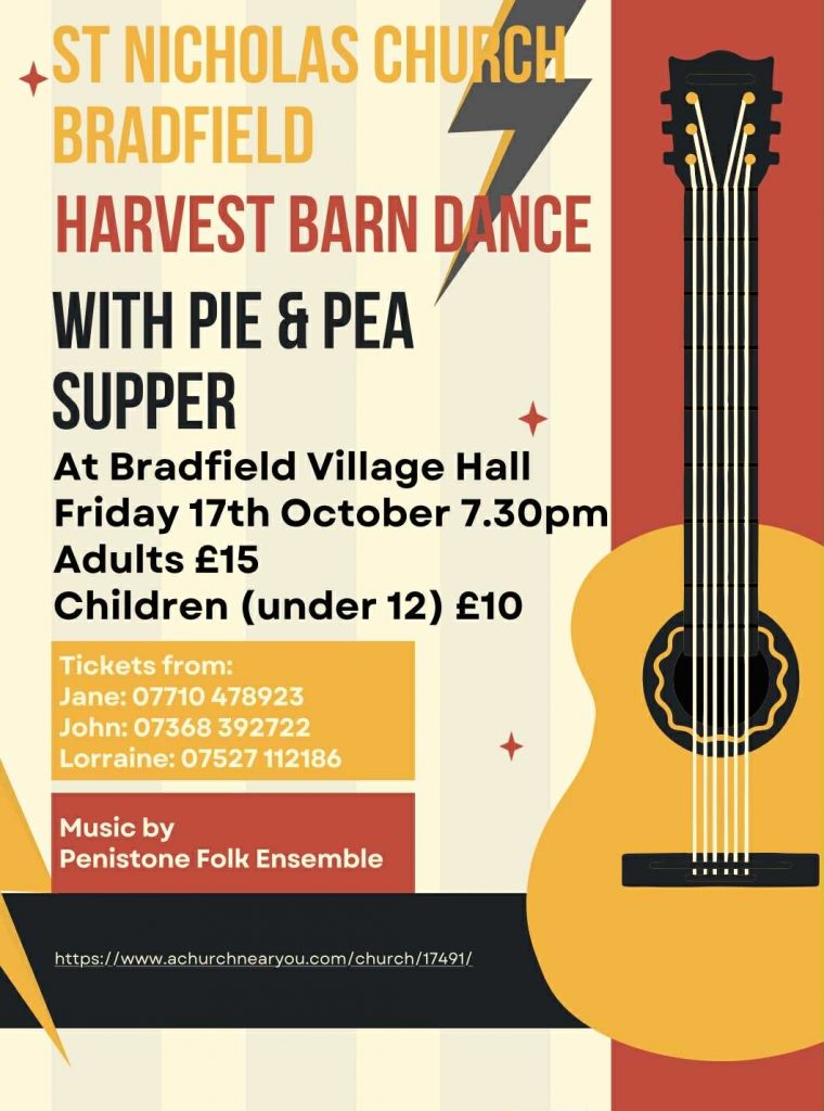 17/10 Harvest Barn Dance at Bradfield Village Hall, with Penistone Folk Ensemble, Pie and Pea Supper. Facebook